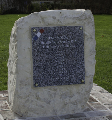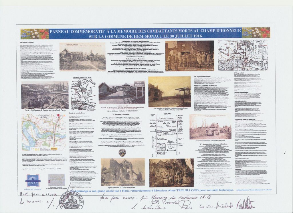 N.b : Depuis l’installation de la stèle, des esprits chagrin nous ont « reproché » d’avoir omis d’y inscrire le nom de certains régiments ayant participé à la bataille de la Somme dans son ensemble. Alors il est nécessaire de rappeler que le panneau et la stèle commémorent uniquement la bataille du 30 juillet 1916 à Hem-Monacu.