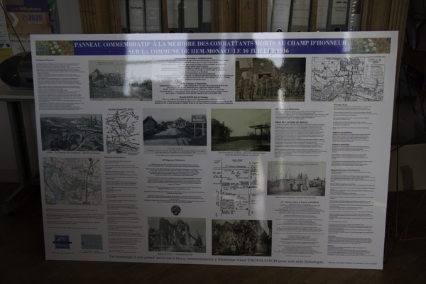 Il y a plusieurs années, dans le cadre des manifestations du 90e anniversaire de la Grande Guerre, notre président avait écrit un historique, créé un parcours de mémoire et, pour l’inaugurer, organisé sur celui-ci une grande marche afin de commémorer la bataille du 30 juillet 1916 à Hem-Monacu. « Et si – nous dit-il un jour – nous placions dans cette commune, un panneau commémoratif en souvenir de cette bataille ».