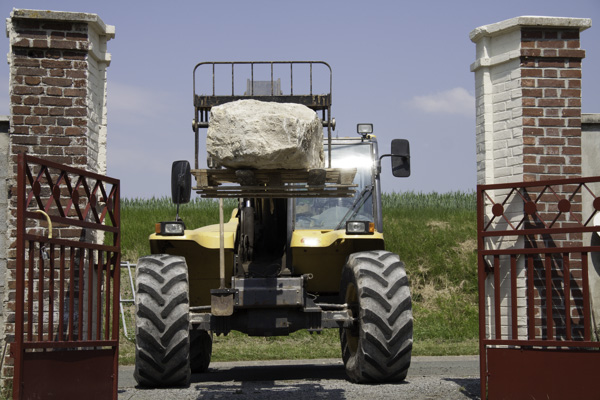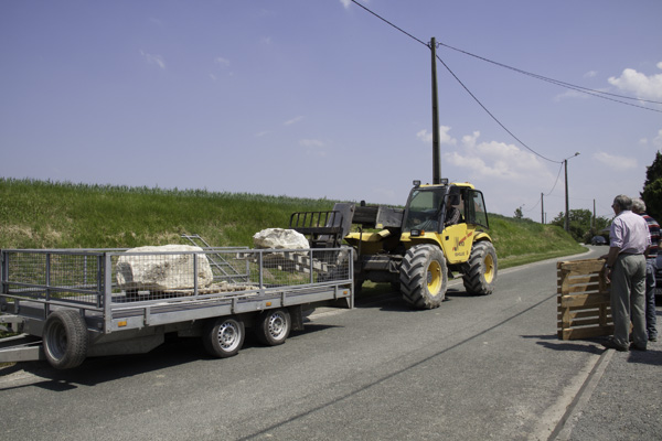 Quant au bloc de pierre, qui une fois taillé donnera naissance à la stèle, il nous a été offert par le propriétaire-exploitant de la carrière de Cappy. Mais déplacer ce bloc d’environ 400 kg ainsi que son petit-frères (*) nécessite un engin de dimension et une remorque adaptée !